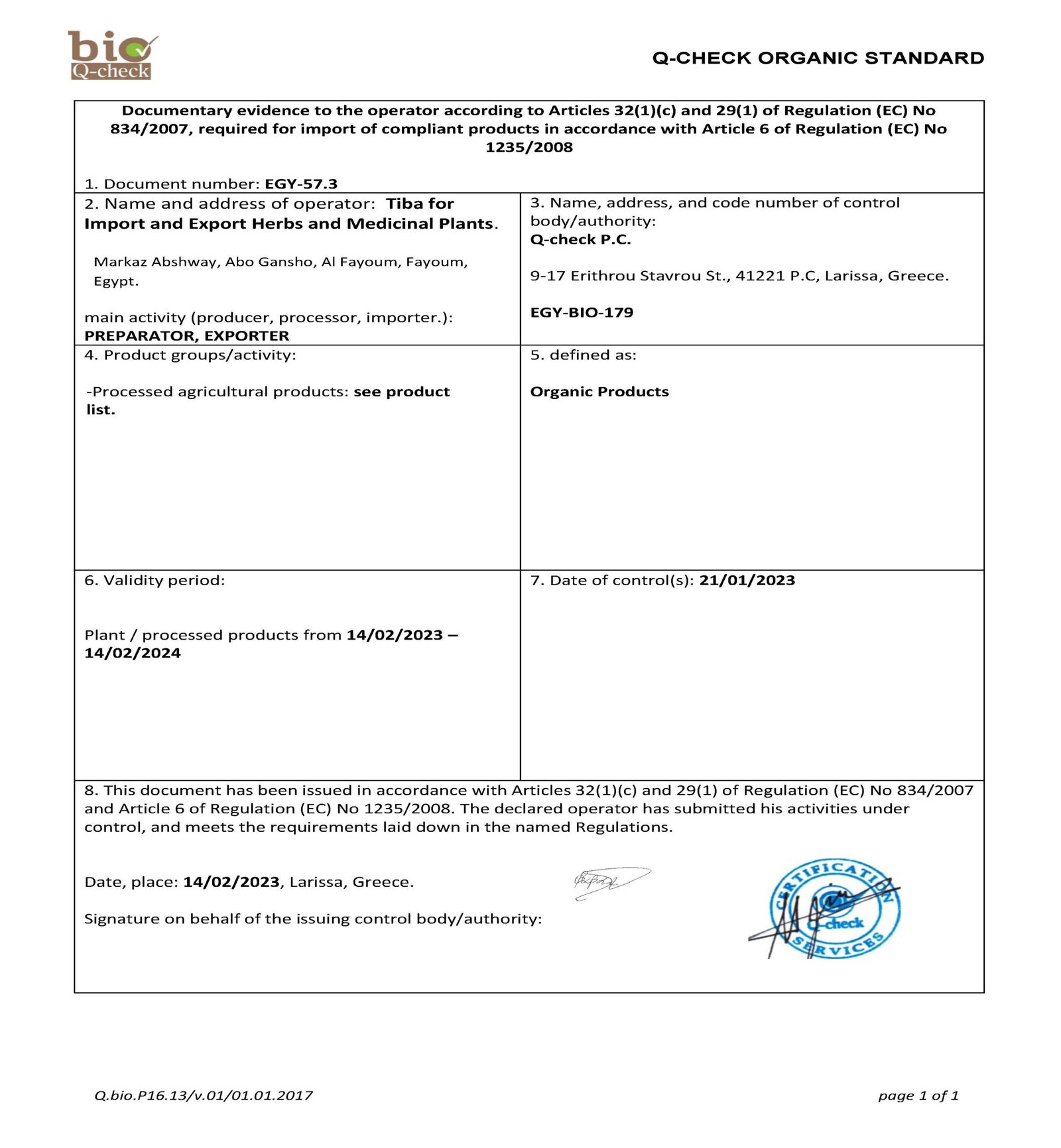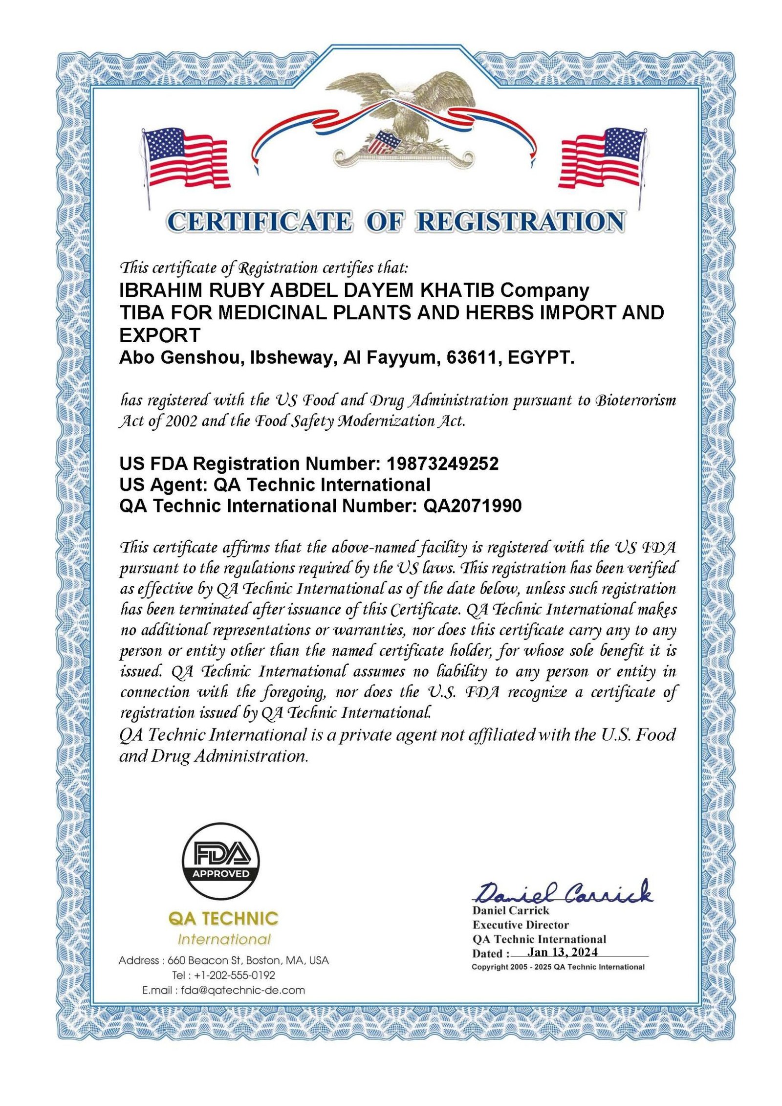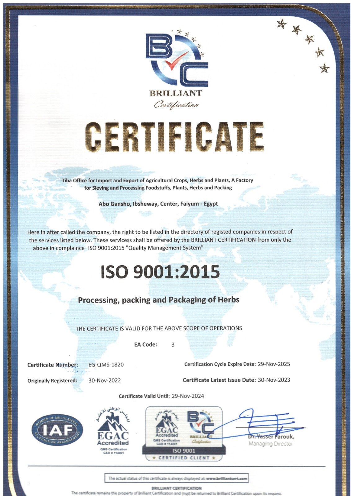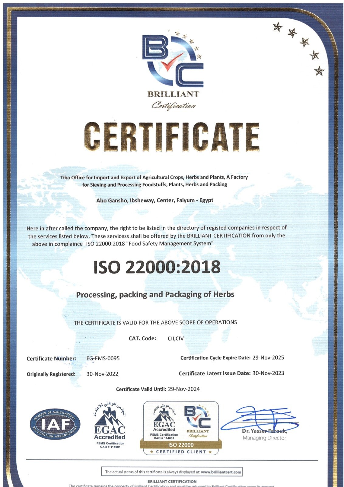 At Tiba El Ruby, quality is at the heart of everything we do. From the careful selection of seeds to the final stages of packaging and export, every step of our process is guided by strict international standards. We are proud to hold globally recognized certifications, including ISO 22000, ISO 9001, and FDA approval, which reflect our commitment to food safety, consistency, and excellence. These certifications are not just documents — they are proof of our dedication to delivering premium Egyptian herbs and spices that meet the expectations of global markets.